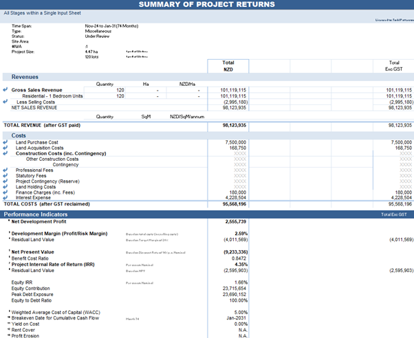 The outputs for this indicated a negative residual land value based on the hurdle rates above. In essence, this project is not feasible under these parameters specified above as the business case is only supported if nothing is paid for the land.