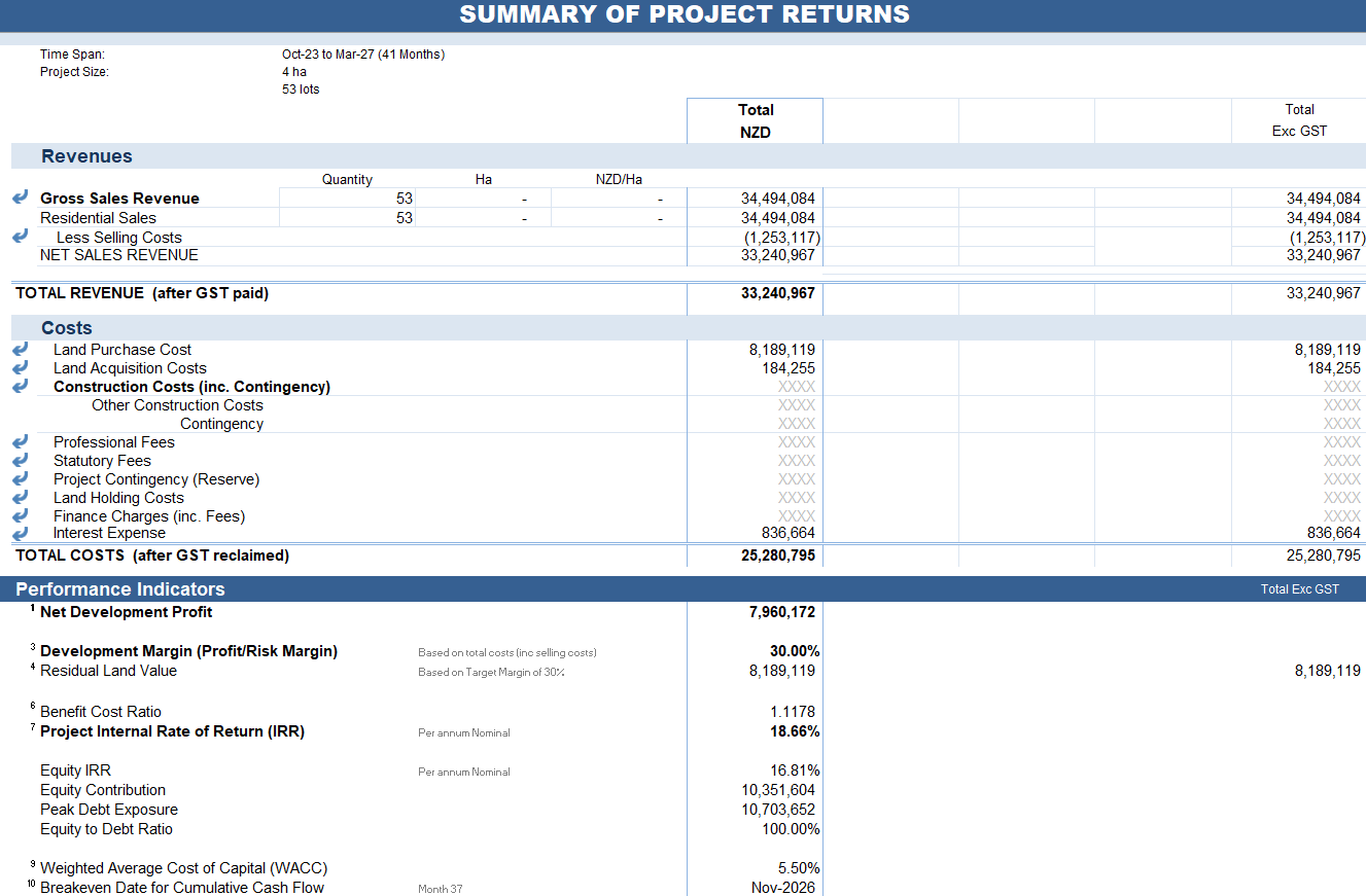 The outputs for this indicated a residual land value of $8,189,119+GST with a project Internal Rate of Return of 18.66% and total project costs of $25,280,000. This is an estimate for residual land value based on developing similar to that proposed in the Fulton Hogan plan.
